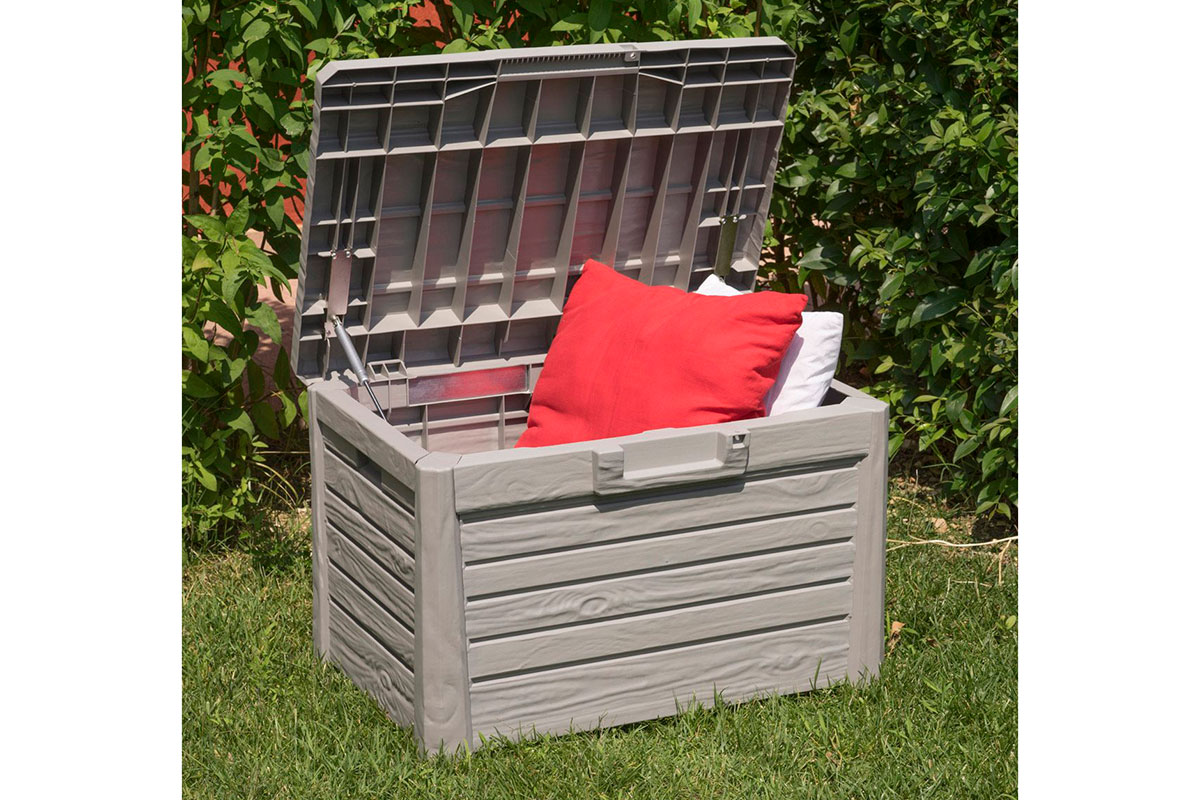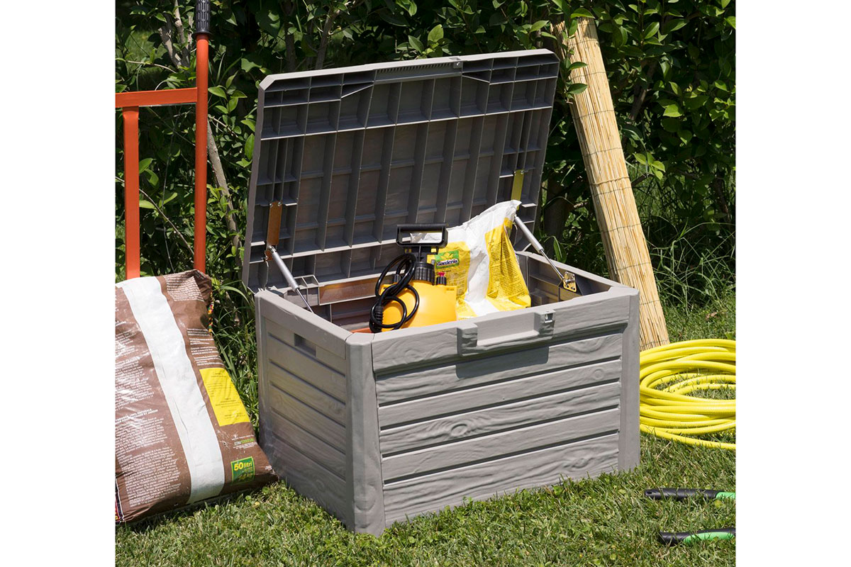 Компактный ящик-сундук FLORIDA COMPACT на 120 л с гидролифтом и фиксаторами от TOOMAX идеален для организации хранения хозинвентаря на участке загородного дома, спортивного инвентаря, подушек для садовой мебели, вещей во влажном помещении, дома, на балконе, террасе или в подвале, хранения овощей, складирования запчастей и инструмента в гараже и т.д. Ящик FLORIDA COMPACT - одна из прочных моделей широкого ассортимента Toomax. Выдерживает вес до 180 кг, с комфортом на крышке разместиться один взрослый человек. Стилизованный под дерево маленький садовый сундук. Сборно-разборный, компактный в перевозке, всепогодный сундук. Ручки для переноски. Верхняя крышка с гидролифтом для плавного открывания и удерживания крышки, предусмотрены отверстия для навесного замка. Отличительными особенностями сундуков от TOOMAX являются: итальянский дизайн, стильный внешний вид, современная цветовая гамма, высокая прочность и долговечность. По сравнению с деревянными или металлическими ящиками пластиковые не подвержены гниению, ржавению, выцветанию, и не требуют абсолютно никакого ухода. Преимущества садового сундука FLORIDA COMPACT