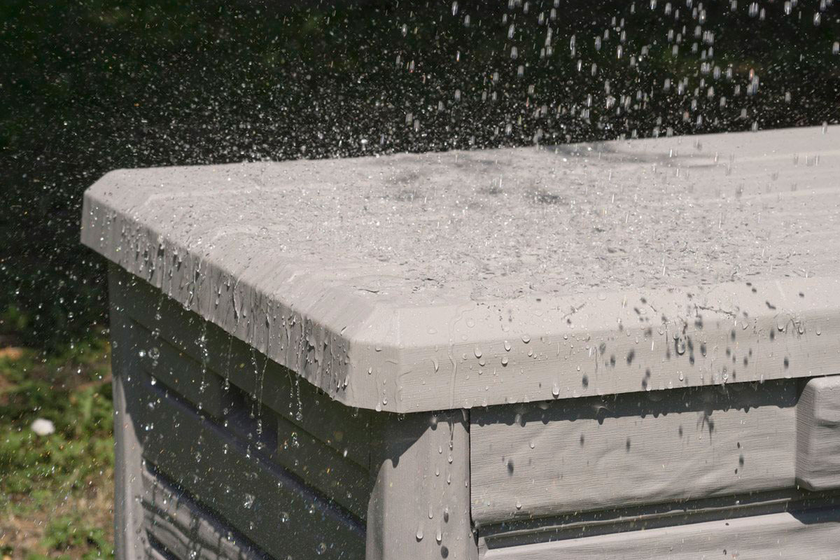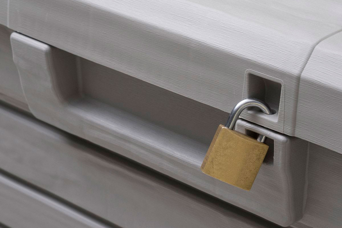 Материал - всепогодный пластик, объём 120 л. Выдерживает вес 1-го взрослого человека. Обеспечивает хранение в условиях сухости и проветривания. Откидная крышка с фиксаторами и гидролифтом, имеются проушины для навесного замка. Стильный вид "под дерево".