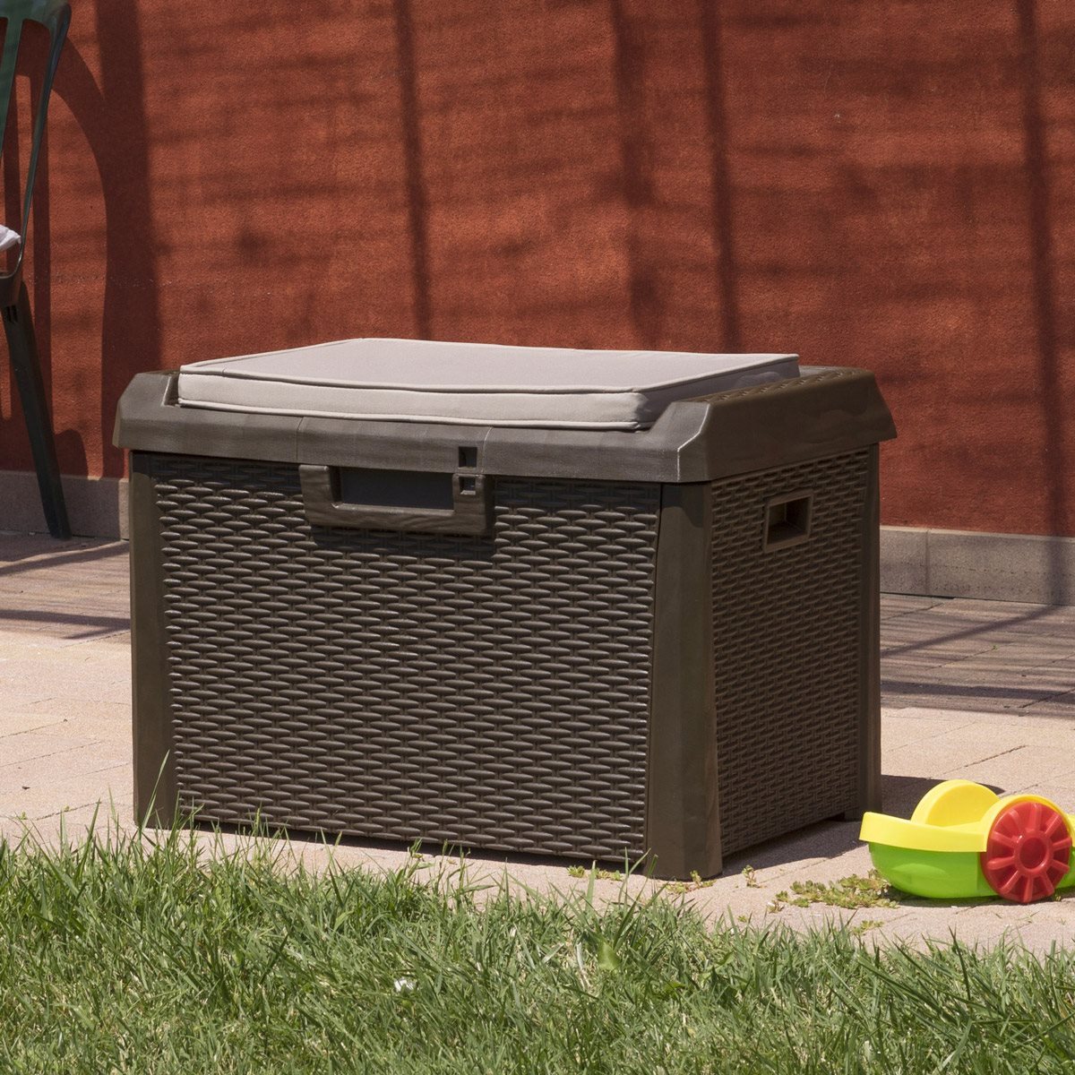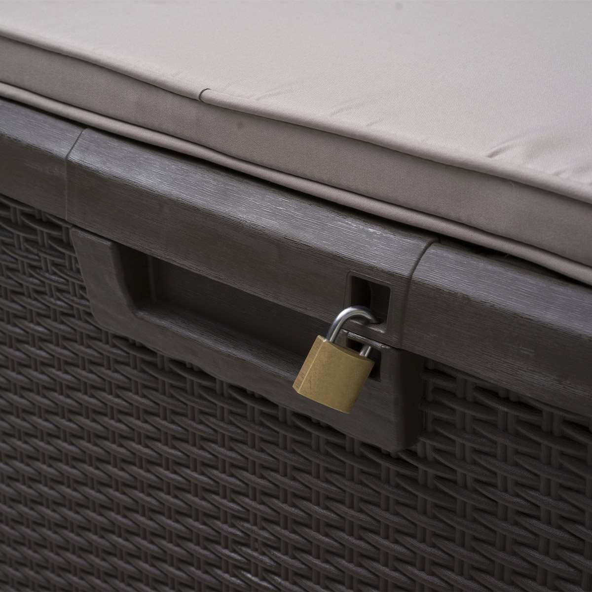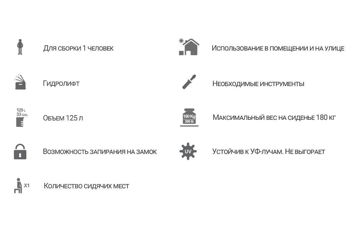 Материал - всепогодный пластик, плетение под ротанг, объём 120 л. Выдерживает вес 1-го взрослого человека. Обеспечивает хранение в условиях сухости и проветривания. Откидная крышка с фиксаторами и гидролифтом, имеются проушины для навесного замка. Подушка на сиденье.
